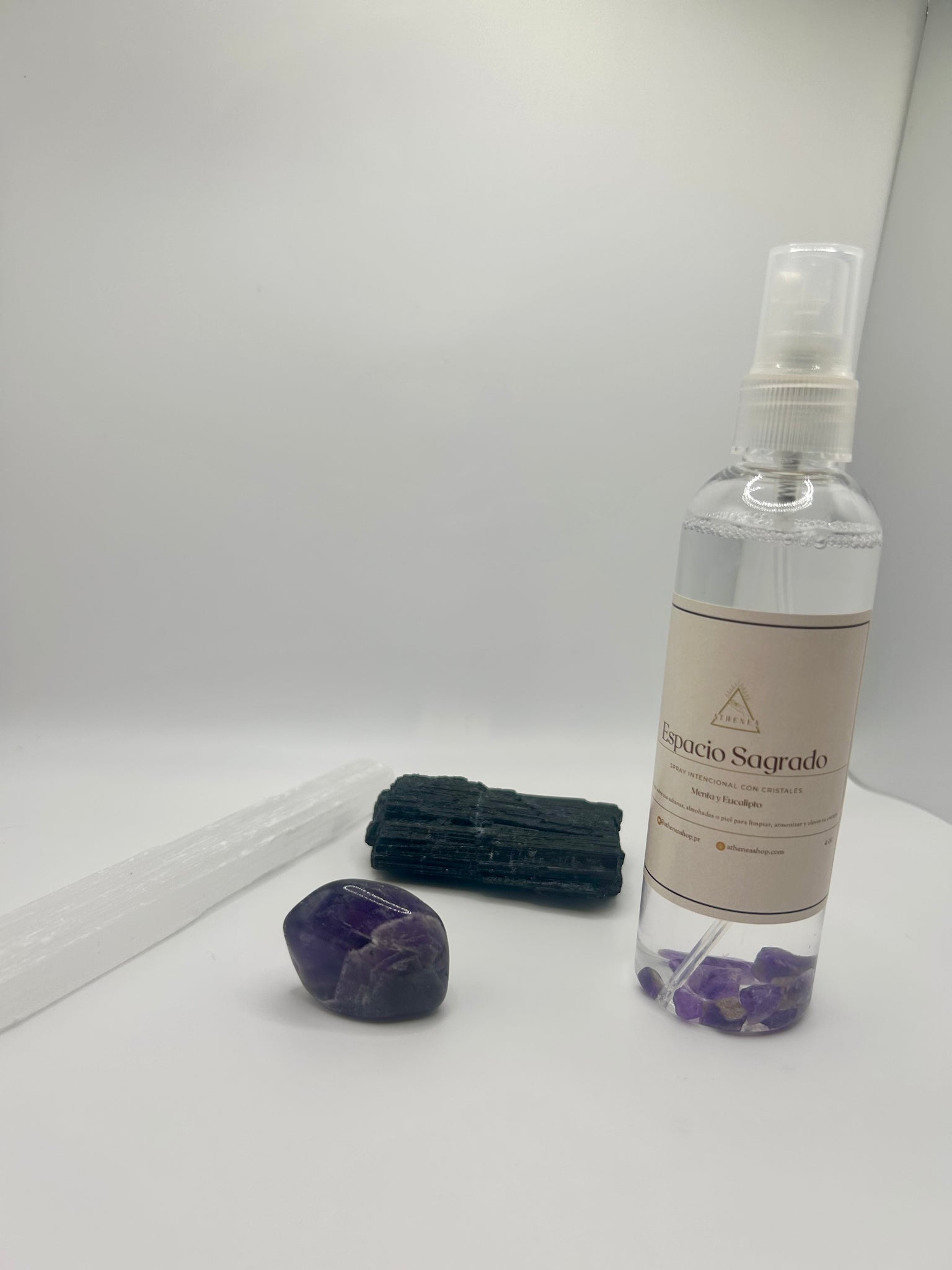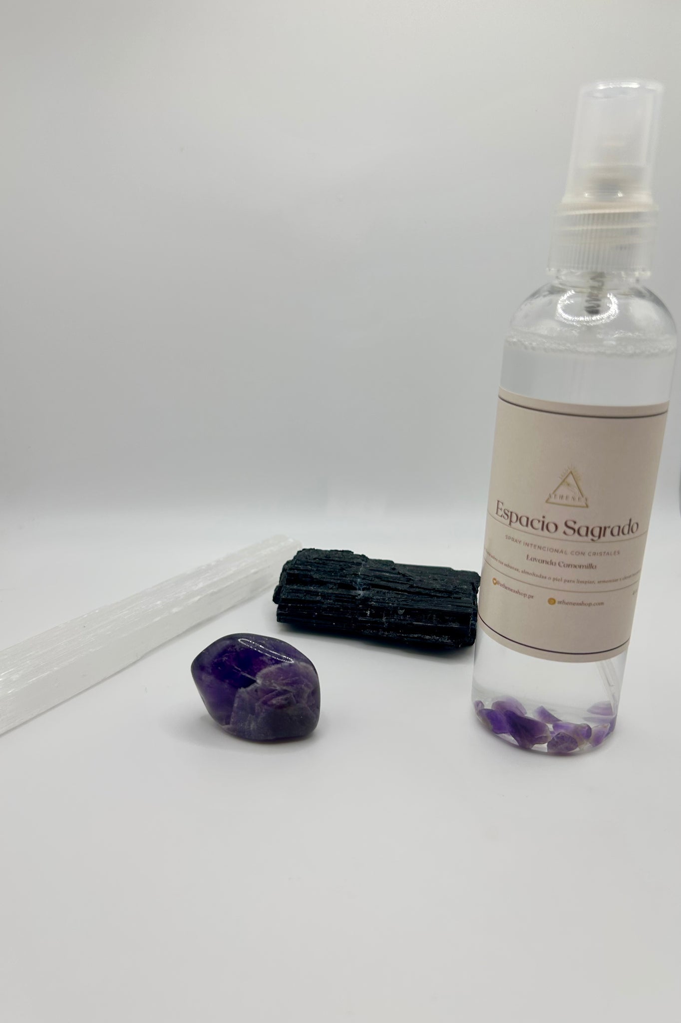 Tienes la opción de comprar el spray solo o acompañarlo por las frecuencias de selenita, amatista y turmalina negra, este trío de cristales actúa como un escudo protector que limpia, equilibra y sella la energía del lugar este set se creó con el fin de limpiar y armonizar el espacio donde duermes. Las piedras irán en lugares específicos.